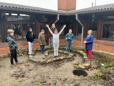 In den vergangenen Monaten hat sich die Umwelt-AG um die alte Kräuterspirale auf dem westlichen Pausenhof gekümmert. Die in die Jahre gekommene und relativ kleine Kräuterspirale wurde von den Schülerinnen und Schülern in Zusammenarbeit mit Frau Glaubitz komplett neu angelegt. Zunächst mussten alte Steine und Pflanzen abgetragen werden. Um die Spirale vergrößern zu können, wurde neue Erde verteilt, die Steinreihen neu ausgerichtet und mit weiterer Erde befüllt. Am Ende der Spirale ist ein Bottich angesiedelt, der zur Wasserversorgung dient. Im nächsten Schritt werden nun verschiedene Kräuter angepflanzt. Die Insekten und besonders die Bienen, aber auch die Schüler:innen werden sich über die Kräuter freuen können. Den Insekten liefern sie Pollen und Nektar und die Schüler:innen können die Kräuter im Hauswirtschaftsunterricht zum Kochen und Backen nutzen. Wie praktisch, dass die Kräuterspirale direkt vor der Küche liegt!